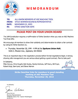 The IAM Constitution requires a reaffirmation of Strike Sanction when you vote on ASC Machine Tool final offer.