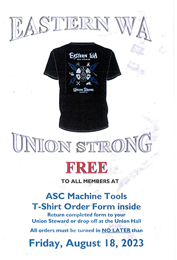 T-shirts were distributed this week. If you did not get a chance to fill out one reform, please ask your Union steward, subcommittee member or call Leslie at the Union Hall. (509) 534-9690