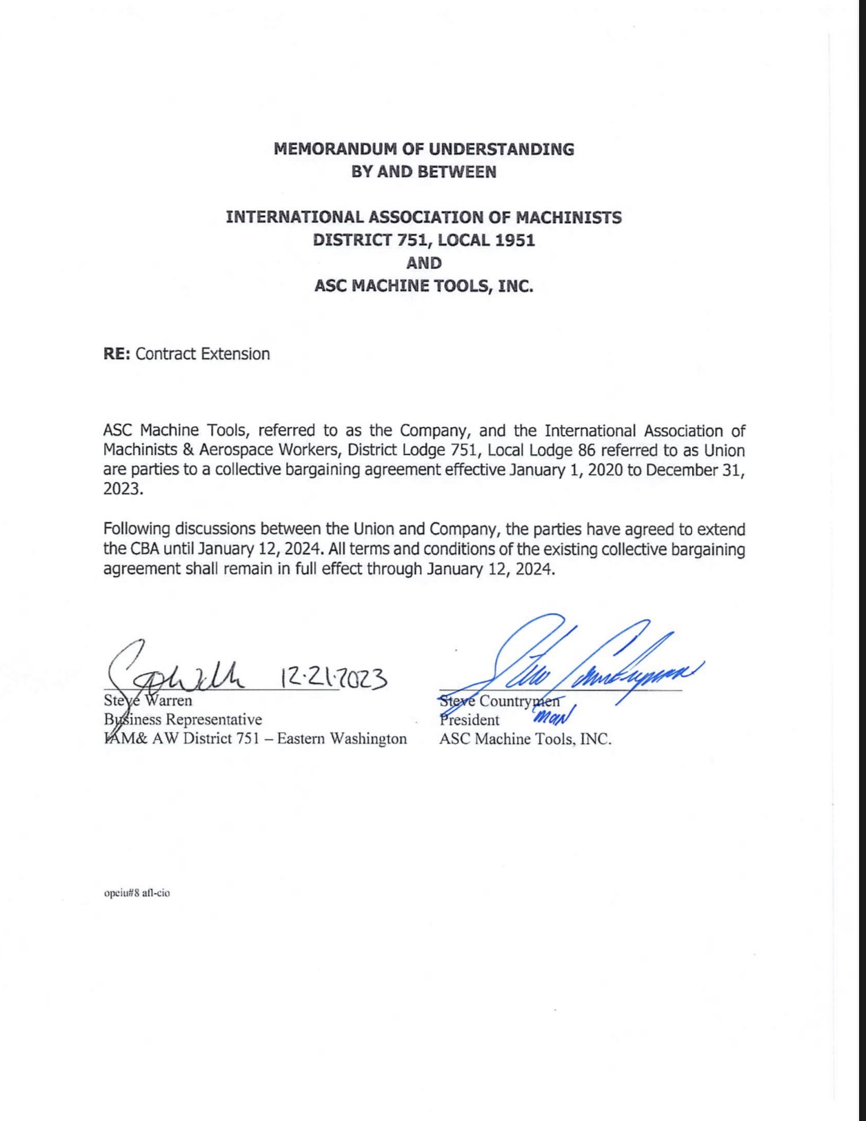 ASC Machine Tools met with your negotiation committee to discuss the Company's last proposal form Thursday, December 19, 2023. The Company made adjustment in overtime language form the Company’s last proposal regarding no mandatory overtime on Saturday.