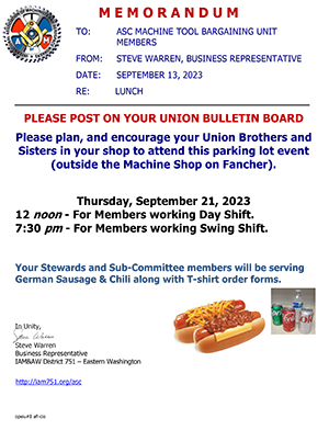 Your subcommittee team has a BBQ lunch planned for this Thursday, October 26, 2023. This will be held during your lunch time at 12 noon for day shift and 7:30 pm for swing shift. We will be handing out Surveys and Contract Negotiation Process books. Please plan and encourage everyone to attend.