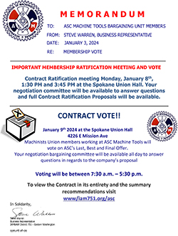 Contract Vote and ratification Meeting will be held at Spokane Union Hall. LL 86. 4226 E. Mission, Spokane Wa.
